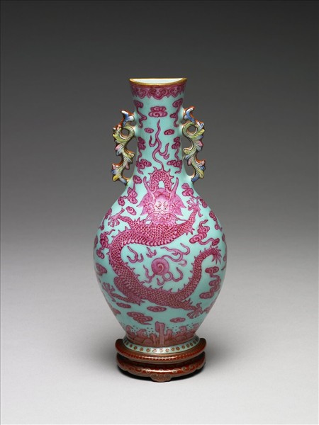 瓷胎,前方為侈口,長頸,雙卷葉形耳,斜肩,圓腹,半圓形仿雲形板足木座形圈足,後為平面,兩旁有支釘痕,腹部有二小圓孔,一方孔,圈足處有二小圓孔以便吊掛於牆,本器形稱為轎瓶。器內施白釉,器表為淺藍地,前方以粉紅色釉在口沿飾如意雲紋,於器身繪團雲龍紋及朵雲紋,下方繪水波紋,棕色仿雲形板足木座上以金彩繪卷草紋及如意雲紋。底有金色「乾隆年製」單行橫向四字篆款。與中瓷000551成對。