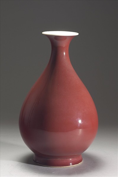 侈口外撇,束頸碩腹,圈足略外撇。整器施積紅釉,釉色勻亮,器內白釉。圈足露胎一圈,足內白地青花雙圈「大清雍正年製」雙行六字楷款。