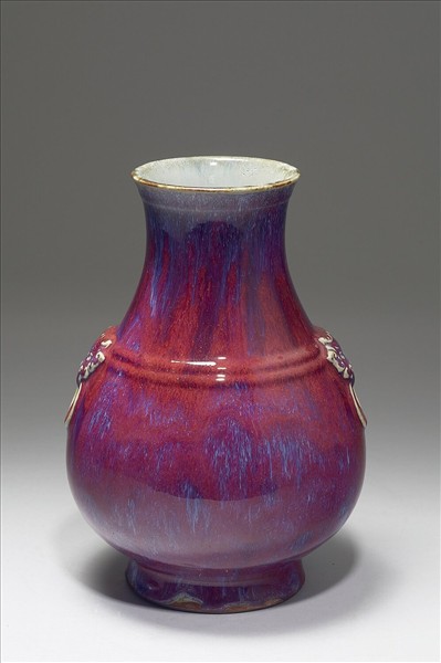 侈口束頸,斜肩,碩腹下垂,雙鋪首暗環,頸腹交界處有弦紋兩道,圈足外撇。口沿塗金一圈,器內白釉,器壁爐鈞釉,呈色為紅帶靛藍色。足露胎一圈圖褐色汁,足內醬釉地印「雍正年製」雙行四字篆款。
