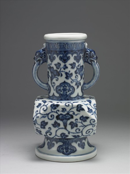 直口,卷邊,長頸,雙螭形耳,方形折邊腹,圈足外撇。以青花繪製圖紋,頸部上方飾一圈回紋,頸部與腹部繪纏枝牽牛花,頸部上下有如意雲紋邊飾,圈足繪一圈如意雲紋,雲頭內繪花卉紋。足緣呈淺褐色。底施白釉藍書「大清雍正年製」二行楷書雙圓框款。與中瓷000566N000000000為一對。