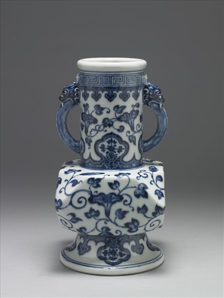 直口,卷邊,長頸,雙螭形耳,方形折邊腹,圈足外撇。以青花繪製圖紋,頸部上方飾一圈回紋,頸部與腹部繪纏枝牽牛花,頸部上下有如意雲紋邊飾,圈足繪一圈如意雲紋,雲頭內繪花卉紋。足緣呈淺褐色。底施白釉藍書「大清雍正年製」二行楷書雙圓框款。與中瓷000565N000000000為一對。