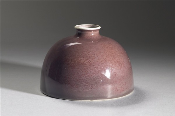 小口微外侈,短頸溜肩,廣腹,形似半圓球,平底凹足。器身施銅紅釉,因受窯爐溫度影響,呈色有深淺之別,類似豇(音同姜)豆色澤,故有豇豆紅釉之說。器腹淺劃三組暗花團螭紋,口沿及器內施白釉,外底有「大清康熙年製」楷體款識。此類小口半圓穹狀的器型一般被稱為「太白尊」,然而清宮檔案舊稱為「花囊」。對照西洋傳教士殷弘緒的書簡,得知是以吹釉法施釉。