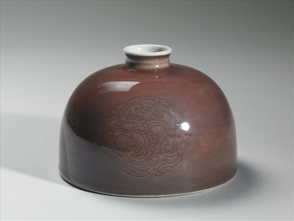 小口微外侈,短頸溜肩,廣腹,形似半圓球,平底凹足。器身施銅紅釉,因受窯爐溫度影響,呈色有深淺之別,類似豇(音同姜)豆色澤,故有豇豆紅釉之說。器腹淺劃三組暗花團螭紋,口沿及器內施白釉,外底有「大清康熙年製」楷體款識。此類小口半圓穹狀的器型一般被稱為「太白尊」,然而清宮檔案舊稱為「花囊」。對照西洋傳教士殷弘緒的書簡,得知是以吹釉法施釉。