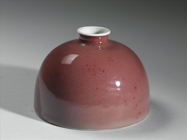 小口微外侈,短頸溜肩,廣腹,形似半圓球,平底凹足。器身施銅紅釉,因受窯爐溫度影響,呈色有深淺之別,類似豇(音同姜)豆色澤,故有豇豆紅釉之說。器腹淺劃三組暗花團螭紋,口沿及器內施白釉,外底有「大清康熙年製」楷體款識。此類小口半圓穹狀的器型一般被稱為「太白尊」,然而清宮檔案舊稱為「花囊」。對照西洋傳教士殷弘緒的書簡,得知是以吹釉法施釉。