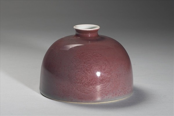 小口微外侈,短頸溜肩,廣腹,形似半圓球,平底凹足。器身施銅紅釉,因受窯爐溫度影響,呈色有深淺之別,類似豇(音同姜)豆色澤,故有豇豆紅釉之說。器腹淺劃三組暗花團螭紋,口沿及器內施白釉,外底有「大清康熙年製」楷體款識。此類小口半圓穹狀的器型一般被稱為「太白尊」,然而清宮檔案舊稱為「花囊」。對照西洋傳教士殷弘緒的書簡,得知是以吹釉法施釉。