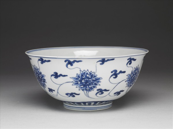 口微撇,深弧形壁,矮圈足。器表以青花描繪纏(轉)枝番蓮紋,下緣繪一周蓮瓣紋,圈足亦繪有雙圈邊飾。口緣內外各繪有雙線邊飾,碗心繪單朵番蓮紋外加雙圈,圈足底周緣露胎,胎質細膩淨白,底以青花書「大清康熙年製」二行六字雙圈楷款。