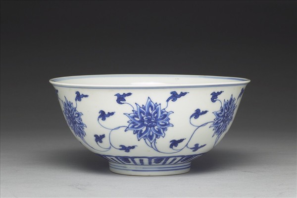 口微撇,深弧形壁,矮圈足。器表以青花描繪纏(轉)枝番蓮紋,下緣繪一周蓮瓣紋,圈足亦繪有雙圈邊飾。口緣內外各繪有雙線邊飾,碗心繪單朵番蓮紋外加雙圈,圈足底周緣露胎,胎質細膩淨白,底以青花書「大清康熙年製」二行六字雙圈楷款。