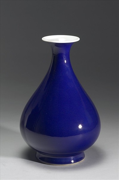 撇口,直頸,溜肩,垂腹,矮圈足。器表施霽青釉,器內與底施白釉。圈足足底周緣露白胎,胎質潔白。底以青花書「大清雍正年製」二行六字雙圈楷款。