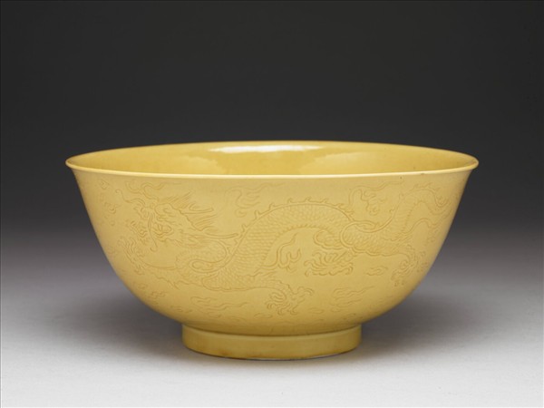 敞口,深弧形壁,矮圈足。全器施黃釉,釉色淺淡,釉層均勻,圈足處略有積釉,呈色較濃,碗心飾劃花龍紋,外壁飾劃花穿花行龍紋,圈足旁飾海水江牙。圈足足底周緣露胎,呈白色,底以青花書「大清康熙年製」二行六字雙圈楷款。