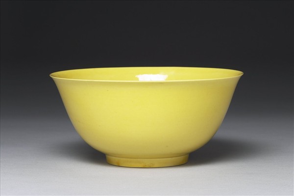 敞口,深壁,矮圈足。全器施黃釉,光素無紋,釉層均勻,圈足處略有積釉,呈色較濃。圈足足底周緣露胎,呈白色,底以青花書「大清康熙年製」二行六字雙圈楷款。