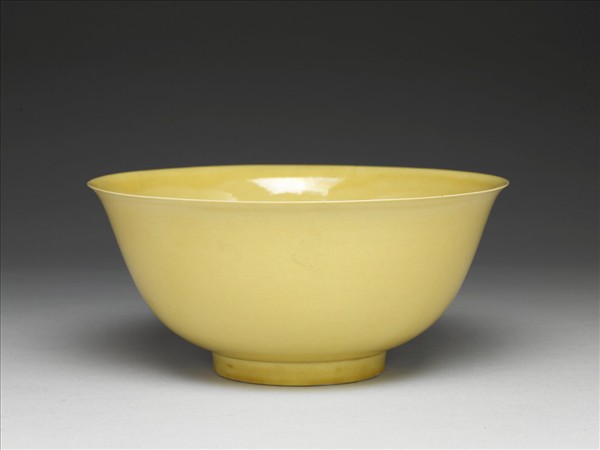 敞口,深壁,矮圈足。全器施黃釉,光素無紋,釉層均勻,圈足處略有積釉,呈色較濃。圈足足底周緣露胎,呈白色,底以青花書「大清康熙年製」二行六字雙圈楷款。