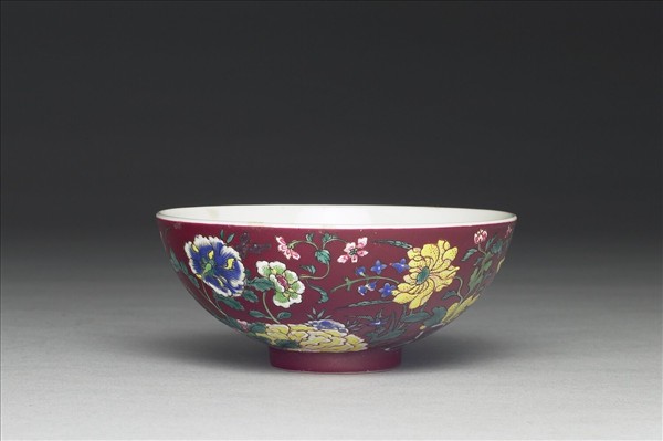 洋彩紅地四季花卉紋碗