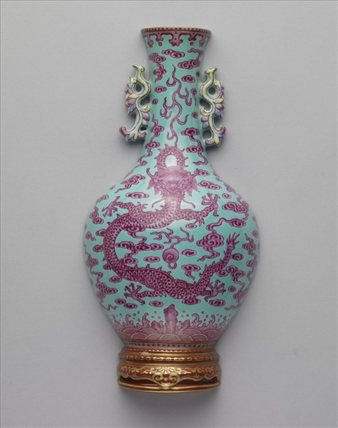 全器如縱剖半器,呈半面瓶形,背為平面,有孔可穿繫固定於牆面或轎子之內,故有壁瓶或轎瓶之稱。清檔中稱之轎瓶。此瓶侈口直頸,碩腹,頸兩側飾葉形雙耳。以湖綠色釉為地,外壁以桃紅色釉繪福山壽海龍紋圖案,間隙填飾祥雲。底座施礬紅釉為地,繪飾金彩花葉,座底以金彩書「嘉慶年製」單行橫向四字篆款。同式器亦見於乾隆朝,只是在圖樣細部上略有不同。