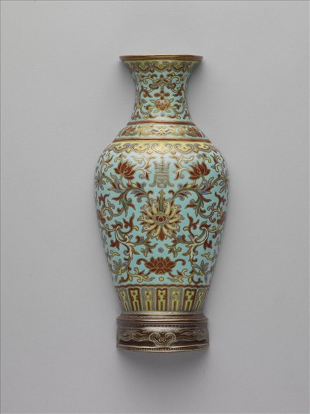 全器如縱剖半面瓶形,背為平面,有孔可穿繫固定於牆面或轎子之內,故有壁瓶或轎瓶之稱。清檔中稱之轎瓶。此瓶侈口束頸,豐肩下斂。外壁施湖綠色釉為地,彩繪描金纏枝番蓮紋,頸部見有磬下掛桃實,腹外壁並見金彩壽字,近底處蓮瓣紋一圈。底座以褐釉金彩書「大清嘉慶年製」單行橫向六字篆款。