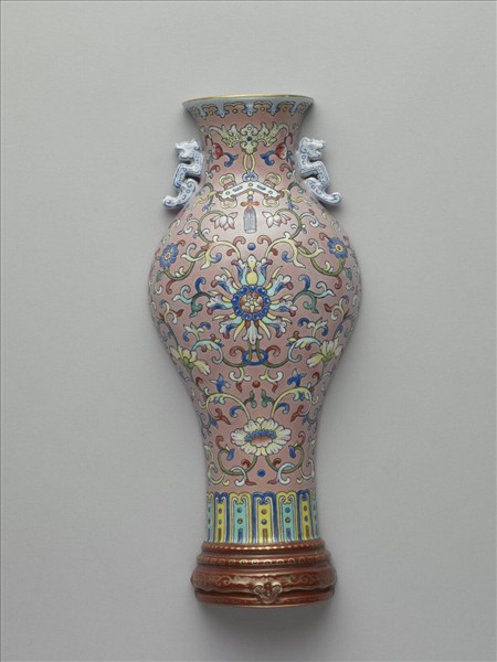 全器如縱剖半器,背為平面,有孔可穿繫固定於牆面或轎子之內,故有壁瓶或轎瓶之稱。清檔中稱之轎瓶。此瓶侈口雙螭耳,碩腹下斂,外壁以粉紅釉為地,彩繪各式圖樣。外壁以纏枝番蓮為主要紋飾,並見蝙蝠啣磬紋,近底處蓮瓣紋一圈。足底施紅釉,內以金彩書「嘉慶年製」單行橫向四字篆款。