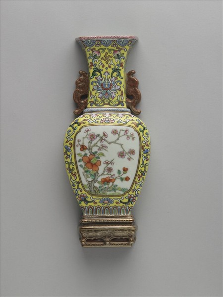 全器如縱剖半器,呈半面帶座雙螭耳瓶形,背為平面,有孔可穿繫固定於牆面或轎子之內,故有壁瓶或轎瓶之稱。清檔中稱之轎瓶。此瓶外壁以黃釉為地,彩繪各式圖樣。頸部盛開番蓮花,其卷葉向上生出桃實,中夾一金彩「壽」字。腹外壁以金彩圍出開光,開光外周繞卷枝花葉,開光內繪白地梅樹花卉。足施褐釉以金彩書「大清嘉慶年製」單行橫向六字篆款。