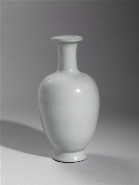 侈口直頸,豐肩弧腹,圈足外撇。全器光素無紋,罩施汝釉,釉色勻淨,有冰裂紋。圈足露胎,塗褐色汁,足內汝釉地「大清乾隆年製」三行六字鈷藍篆款。