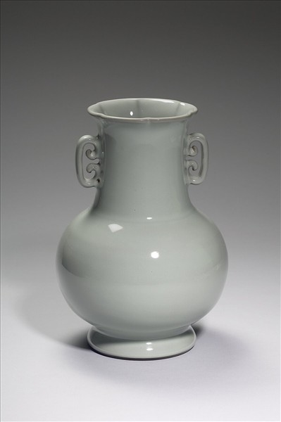 六瓣花形口,口外侈,直頸碩腹,雙如意雲頭形耳,圈足外撇。整器罩施汝釉,色青白而勻淨。圈足露胎,塗褐色汁,足內汝釉地「大清乾隆年製」三行六字鈷藍篆款。
