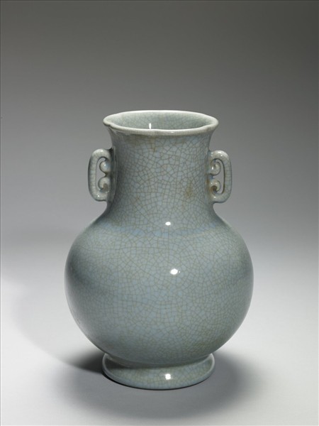 六瓣花形口,口外侈,直頸碩腹,雙如意雲頭形耳,圈足外撇。整器罩施汝釉,色青白而勻淨。圈足露胎,塗褐色汁,足內汝釉地「大清乾隆年製」三行六字鈷藍篆款。