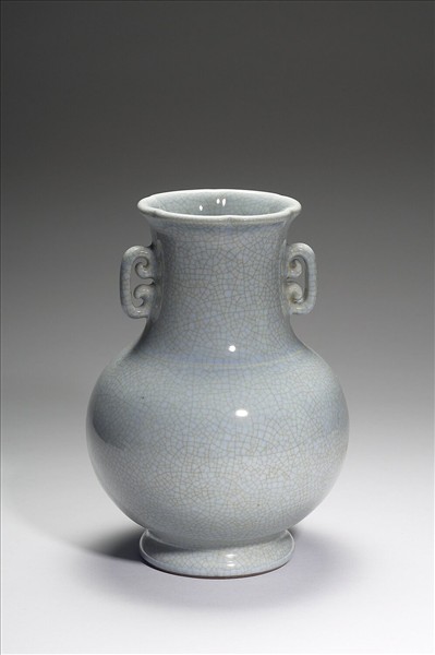 六瓣花形口,口外侈,直頸碩腹,雙如意雲頭形耳,圈足外撇。整器罩施汝釉,色青白而勻淨。圈足露胎,塗褐色汁,足內汝釉地「大清乾隆年製」三行六字鈷藍篆款。