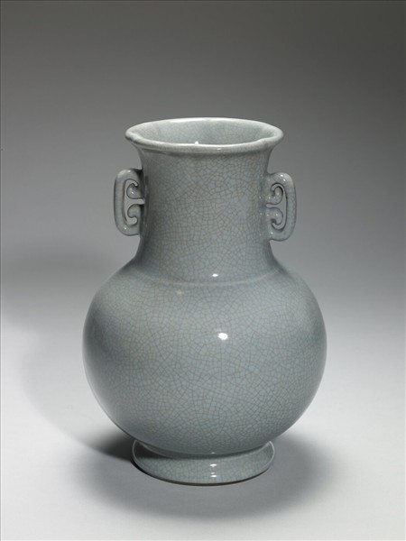 六瓣花形口,口外侈,直頸碩腹,雙如意雲頭形耳,圈足外撇。整器罩施汝釉,色青白而勻淨。圈足露胎,塗褐色汁,足內汝釉地「大清乾隆年製」三行六字鈷藍篆款。