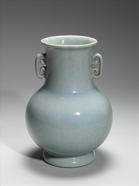 六瓣花形口,口外侈,直頸碩腹,雙如意雲頭形耳,圈足外撇。整器罩施汝釉,色青白而勻淨。圈足露胎,塗褐色汁,足內汝釉地「大清乾隆年製」三行六字鈷藍篆款。