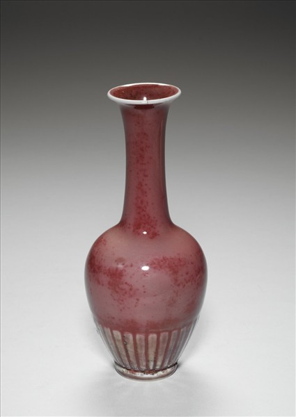 撇口長直頸,豐肩,斂腹,圈足,腹下飾菊瓣紋一周。整器施銅紅釉,呈暗灰紅色,若乳鼠紅;色深淺不均,遍佈深色苔點,口緣流釉呈淡色。圈足及底施白釉,足底露胎,底以青花書「大清康熙年製」六字二行楷款。