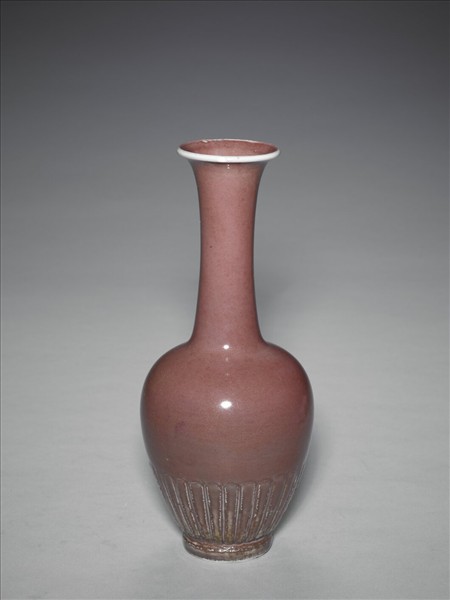 撇口長直頸,豐肩,斂腹,圈足,腹下飾菊瓣紋一周。整器施銅紅釉,釉色濁,有深淺不均的苔點,口緣流釉呈白色。圈足及底施白釉,足底露胎,底以青花書「大清康熙年製」六字二行楷款。