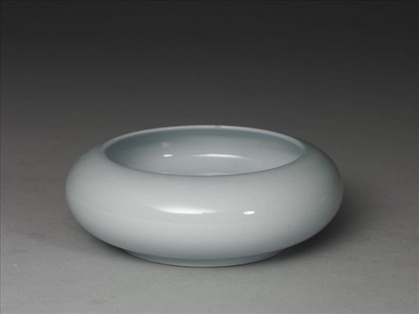 器作矮缽形,圓口內斂,豐圓扁腹,矮圈足。通體施淡藍釉,潔淨光潤,色澤淡雅,平素無紋。足端露白胎,白地底以青花書「大清康熙年製」六字三行楷款。
