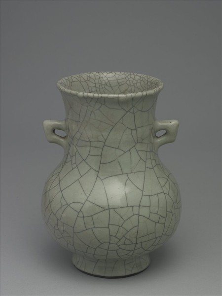 侈口微撇,雙方耳,粗頸圓腹,圈足外撇。整器施青色仿哥釉,並有黑色與淡黃色之開片。圈足露胎塗褐色汁。