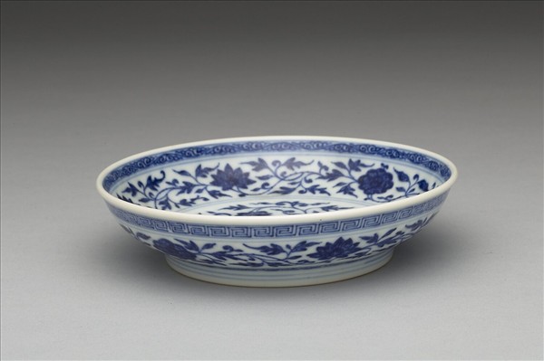 白地青花,侈口,弧壁,圈足。內口沿飾卷草紋一圈,內壁畫轉枝花卉,碗心繪纏枝花卉紋。外口緣回紋一圈,外壁繪飾轉枝四季花卉紋。圈足內有「大清乾隆年製」三行六字篆款。