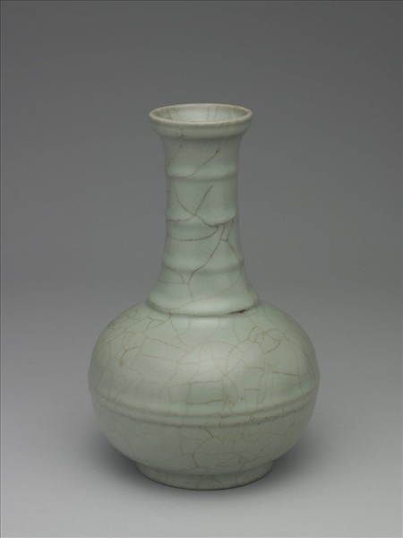 盤口,長直頸,碩腹,圈足。頸上凸起弦文四道。器腹中段凸起弦紋兩道。全器施青釉,釉質腴潤,釉面滿佈赭色開片紋。圈足露胎塗褐色汁。