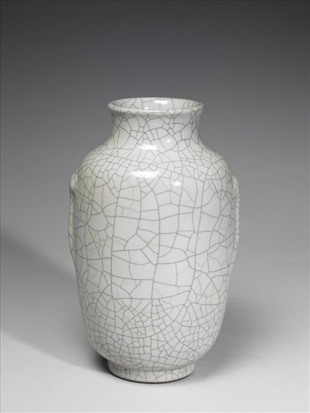 圓口微撇,短頸,豐肩,直腹略向外鼓,雙暗耳,圈足。全器施青釉色灰白,釉色瑩潤,其上滿布深色開片紋線。圈足褐色汁一圈,足內青花書「大清雍正年製」三行六字篆款。