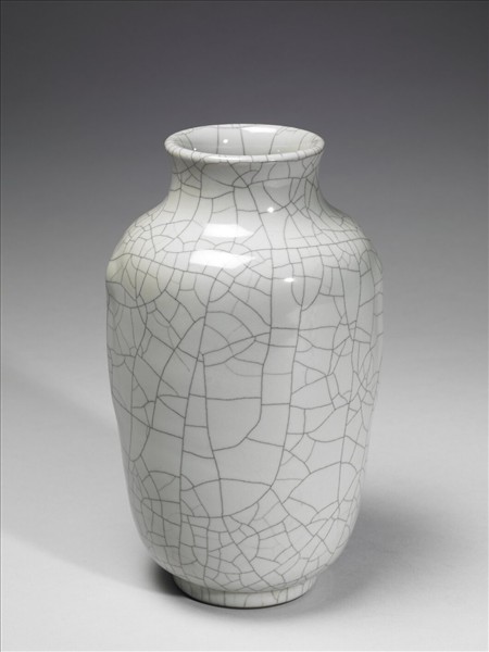 圓口微撇,短頸,豐肩,直腹略向外鼓,雙暗耳,圈足。全器施青釉色灰白,釉色瑩潤,其上滿布深色開片紋線。圈足褐色汁一圈,足內青花書「大清雍正年製」三行六字篆款。
