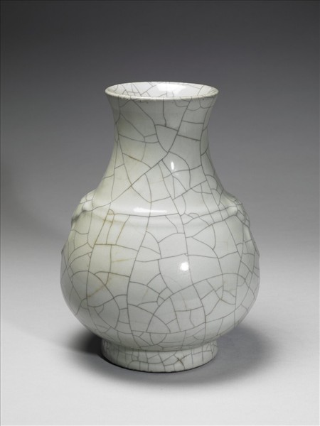 侈口,斜肩,腹下部寬廣,肩處弦紋兩道,並有鋪首銜環暗耳,圈足。全器施青釉色淡白,略泛黃色調,其上滿布深淺色開片紋。圈足褐色汁一圈,足內青花書「大清雍正年製」三行六字篆款。