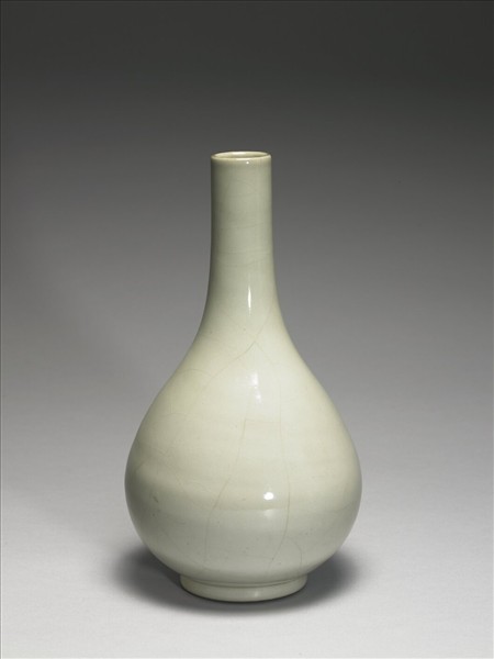 圓口,長直頸,斜肩碩腹,圈足。通體光素,罩施冬青釉,釉質溫潤,並見開片。圈足上褐色汁一圈,內冬青釉地青花「大清雍正年製」三行六字篆款。