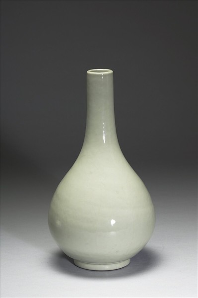 圓口,長直頸,斜肩碩腹,圈足。通體光素,罩施冬青釉,釉質溫潤,並見開片。圈足上褐色汁一圈,內冬青釉地青花「大清雍正年製」三行六字篆款。