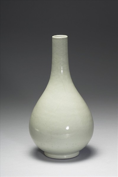 圓口,長直頸,斜肩碩腹,圈足。通體光素,罩施冬青釉,釉質溫潤,並見開片。圈足上褐色汁一圈,內冬青釉地青花「大清雍正年製」三行六字篆款。