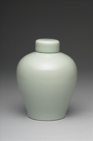 小圓口,短頸,豐肩,碩腹,上豐下斂,平底,淺凹足,帶平頂圓形罩蓋。全器內外通施冬青釉,略泛淡綠,勻淨瑩潤。底青花書「大清雍正年製」六字二行楷款,足緣露白胎。