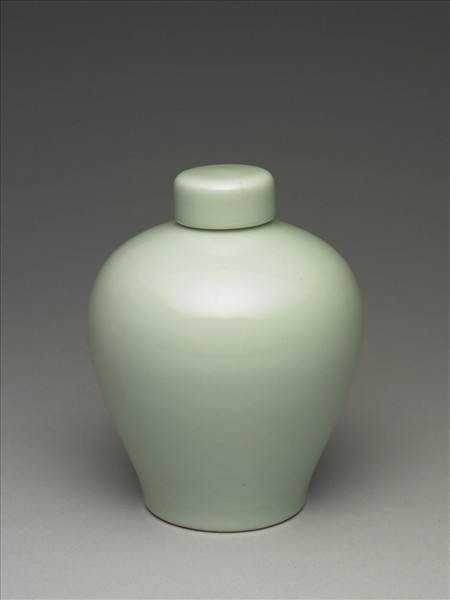 小圓口,短頸,豐肩,碩腹,上豐下斂,平底,淺凹足,帶平頂圓形罩蓋。全器內外通施冬青釉,略泛淡綠,勻淨瑩潤。底青花書「大清雍正年製」六字二行楷款,足緣露白胎。