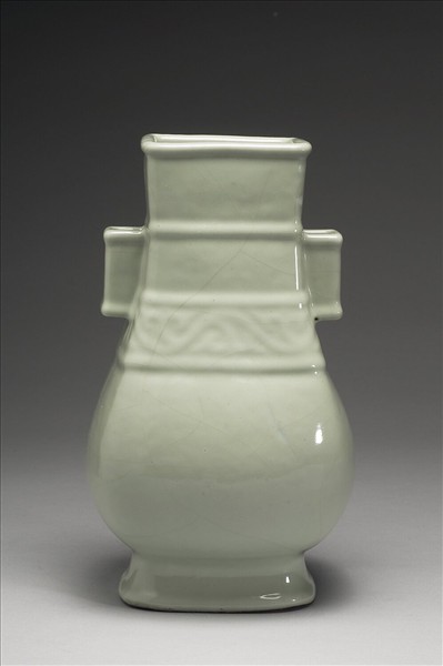扁方形壺,似古銅器壺形,直口,削肩,夸腹,圈足微撇,肩上帶方形貫耳一對。通體施汝釉,色灰綠微帶冰裂紋。肩頸飾起線弦紋三道,下二道間夾飾拱花蔓草紋。器底施汝釉,底心青花書「大清雍正年製」篆款,圈足露胎,塗赭色汁。