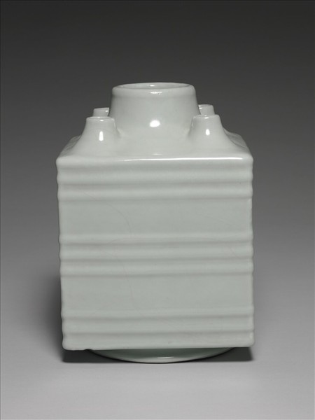 器主體作長方形柱體,五圓口,圈足。五口皆短頸,管內中空,與器體相通,外壁有凸起九道弦紋。施青瓷釉,色灰偏青,並有細開片。外底四角有支釘痕。圈足露胎塗褐色汁,足內滿釉釉下青花書:「大清雍正年製」三行六字篆款。