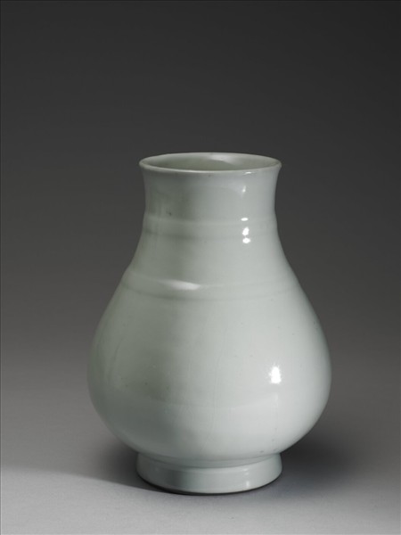 敞口,短直頸,斜肩,碩腹,圈足外撇。器外壁頸部、肩部各凸起寬帶一周。全器施青瓷釉,色凝潤。足緣露胎一圈,塗褐色汁,足內滿釉,足內釉下青花書「大清雍正年製」三行六字篆款。