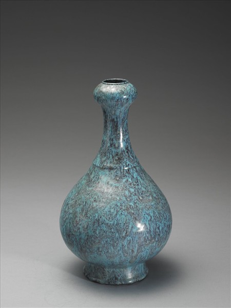 蒜頭口,長頸,碩腹,斜肩,頸肩相接處凸起弦紋一道,圈足。外壁滿施仿鈞爐鈞釉,釉層呈現深、淺藍色流淌交融的乳濁釉效果。足緣露胎一圈,塗褐色汁,足內滿釉,並流淌至足緣,中心釉下模印「雍正年製」雙行四字篆款。爐鈞釉為雍正時出現的新品種,係仿鈞窯窯變釉色而來,採多次施釉,燒成過程中,不同金屬元素自然結合,產生的流動窯變釉色。