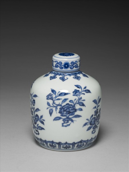 圓口,短頸,短筒狀身,器腹略外鼓,圈足,帶蓋。全器以釉下鈷藍料繪飾紋樣。蓋頂面飾菊花,蓋側壁繪卷枝花卉。器外壁紋飾設計淡雅,在全白的外壁上,等距繪飾折枝花果,折枝花果上下錯落,增添了佈局上的變化。頸部飾如意雲頭紋一圈,外壁近底處畫變形蓮瓣紋一圈,蓮瓣內有倒扣的花朵。整器的鈷藍發色見有多處積澱濃厚或略見乾澀之處,正是模仿明朝永宣青花瓷器發色的效果。足緣露胎一圈,足內釉下青花書「大清雍正年製」雙行六字楷款,外加雙圈。