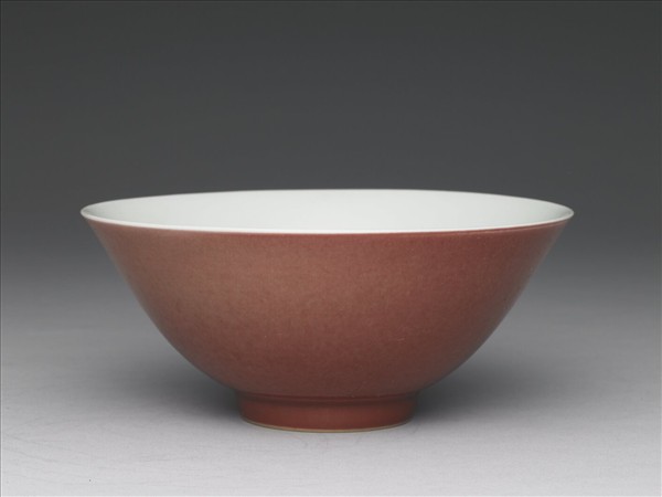 侈口,深弧壁,平底,短圈足。外壁施銅紅色釉,釉色均勻,口沿留有一道白邊,器內及外底施透明釉,圈足底緣露胎一圈,底以青花書「大清雍正年製」六字雙行楷款,外加雙圈。