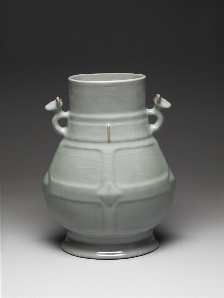 器仿西周青銅壺造型。扁圓體,直頸,碩腹,撇足,頸上有獸首耳一對。通體施青釉,色灰青,帶疏朗的透明開片紋,器腹以縱橫相交的寬帶裝飾。底心青花書「大清雍正年製」篆款,圈足露白胎。