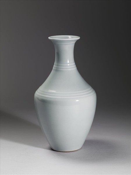 撇口,長頸,寬肩,平底,圈足。通體施青釉,釉色淺青瑩潤,口、頸與肩各飾起線弦紋三道。底心青花書「大清雍正年製」篆款,圈足露胎,塗棕色汁。