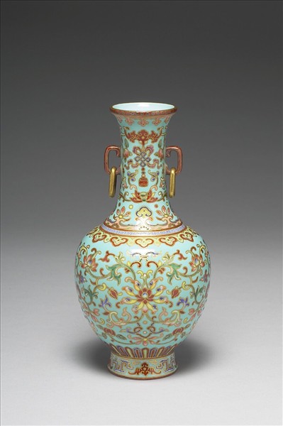 瓷胎,侈口,長頸,頸兩側貼飾方形耳,帶活環,垂肩,斂腹,圈足外撇。器內施白釉,器表施綠彩為地,口沿飾一圈點狀紋,下接一圈如意雲紋,呈正反兩面對稱,頸部上方繪蝙蝠啣盤長與鐘,兩側環繞一對壽桃,下方為番蓮花,頸部下緣飾有一圈番蓮花及如意雲紋,下接一圈卷渦紋;肩部飾一圈如意雲紋,腹部繪纏枝番蓮花紋,兩側各繪有一磬,腹部下緣飾一圈蓮瓣紋,圈足繪蝙蝠及夔龍紋,全器圖紋皆描金邊。足緣露胎,呈白色。底部以淺綠釉為地,以金彩書「大清嘉慶年製」三行篆書款。