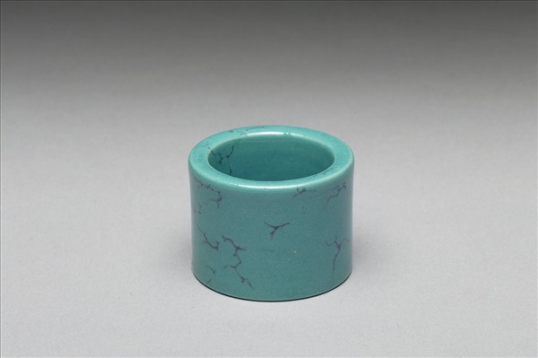 瓷質扳指,短管狀,上下口徑略異。通體施松石綠釉,並出現仿天然石材的灰黑色條紋。本器一式二十件,共同儲裝於一木匣中。